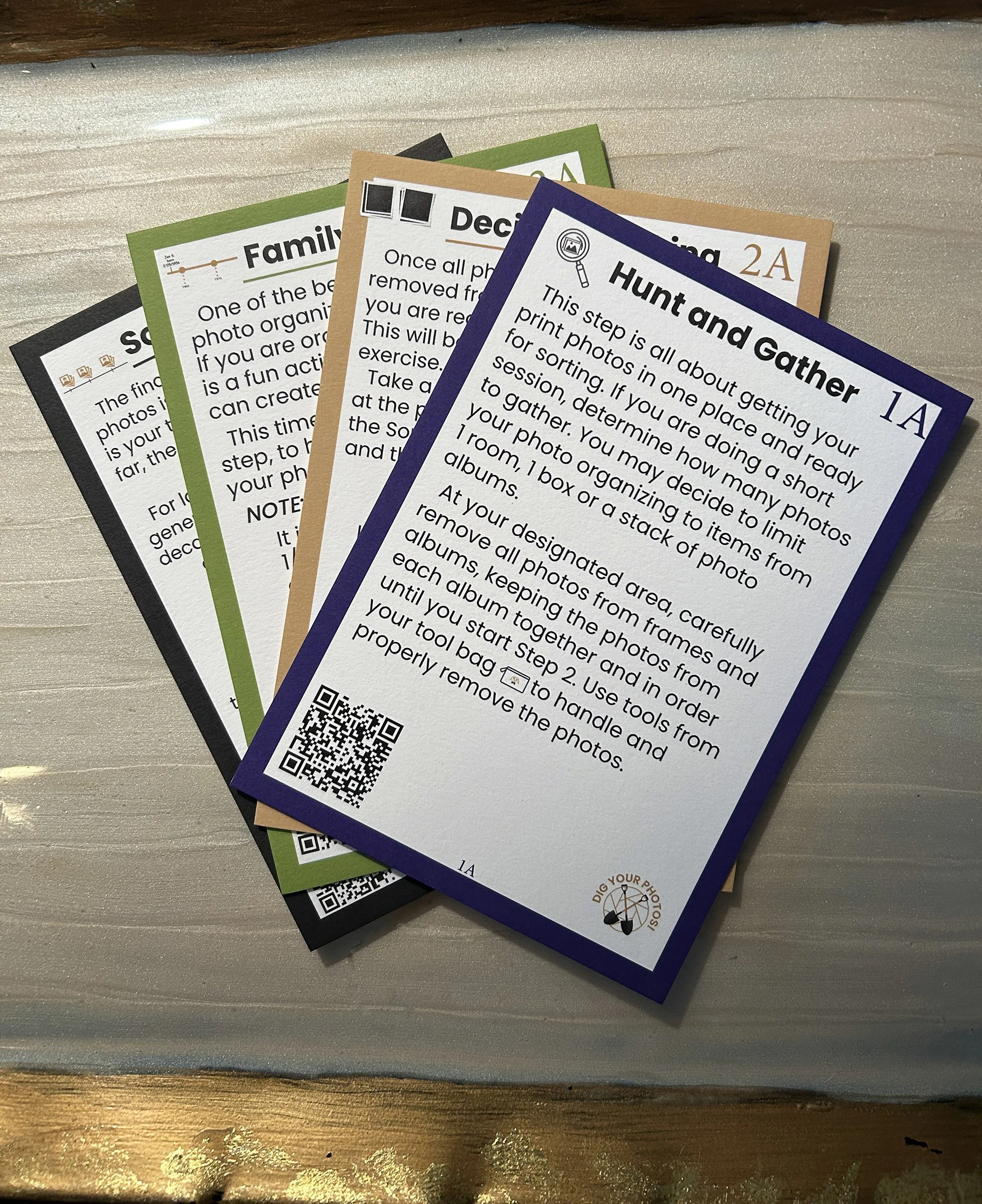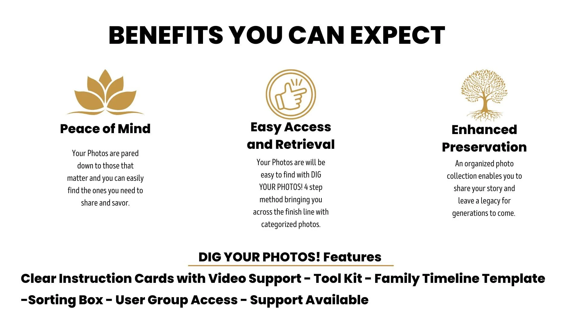 Thats why I created DIG YOUR PHOTOS! the only complete print photo organizing kit on the market. My passion is the help people save their story in their own home. DIG YOUR PHOTOS! offers more than just instructions, it provides step by step recipe cards with video demo links, all the tools needed in a handy tool pouch, the family timeline template and the temporary sorting box to hold 1275 sorted photos. DIG YOUR PHOTOS! will allow you to save your story to leave a legacy and provides you with peace of mind that your photos are safe. Are you ready to organize your photos?